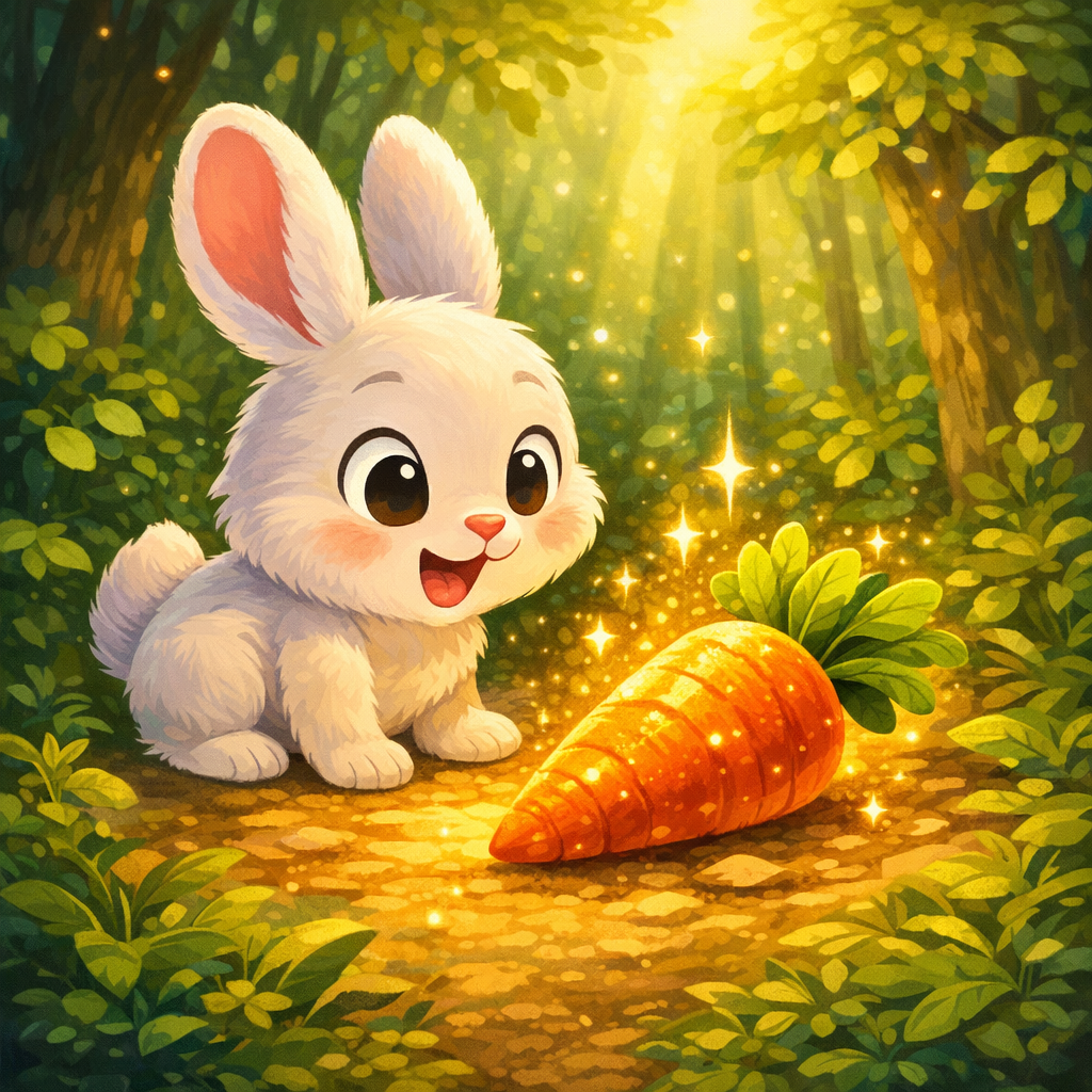 One sunny day, Bunny found something shiny peeking out from the leaves. It was a big, orange carrot! It sparkled in the sunlight and made Bunny’s nose twitch with excitement.