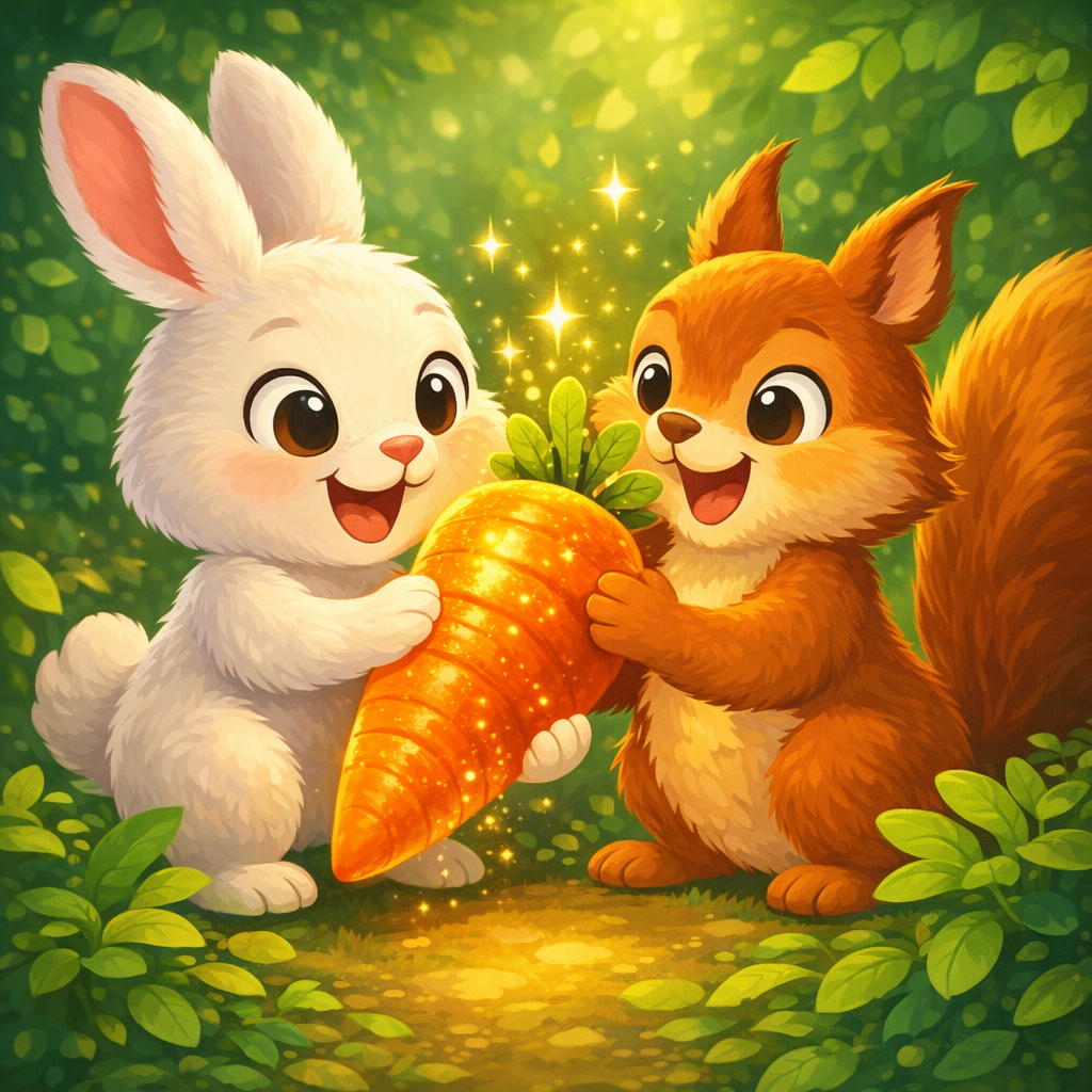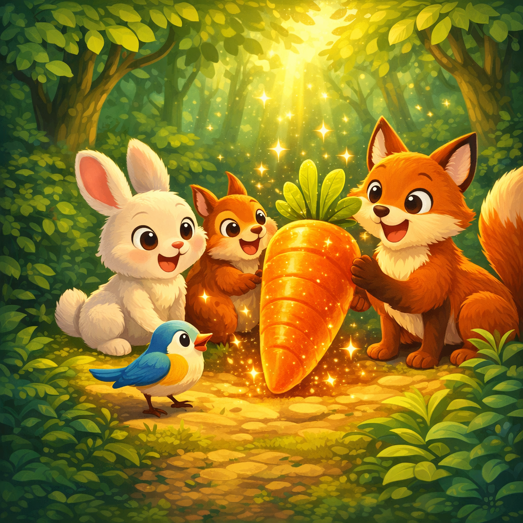 Bunny shared her carrot with Fox and Bird. And guess what? The carrot grew even bigger, glowing like a little sun in the forest!