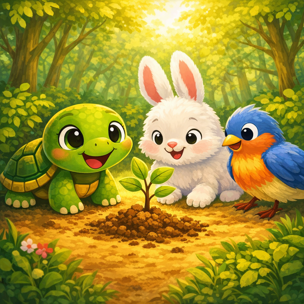 Tilly sourit. ‘Nous avons aidé la terre aujourd’hui !’ dit-elle. Le Lapin et l’Oiseau acquiescèrent. La terre se sentait heureuse, et Tilly aussi.