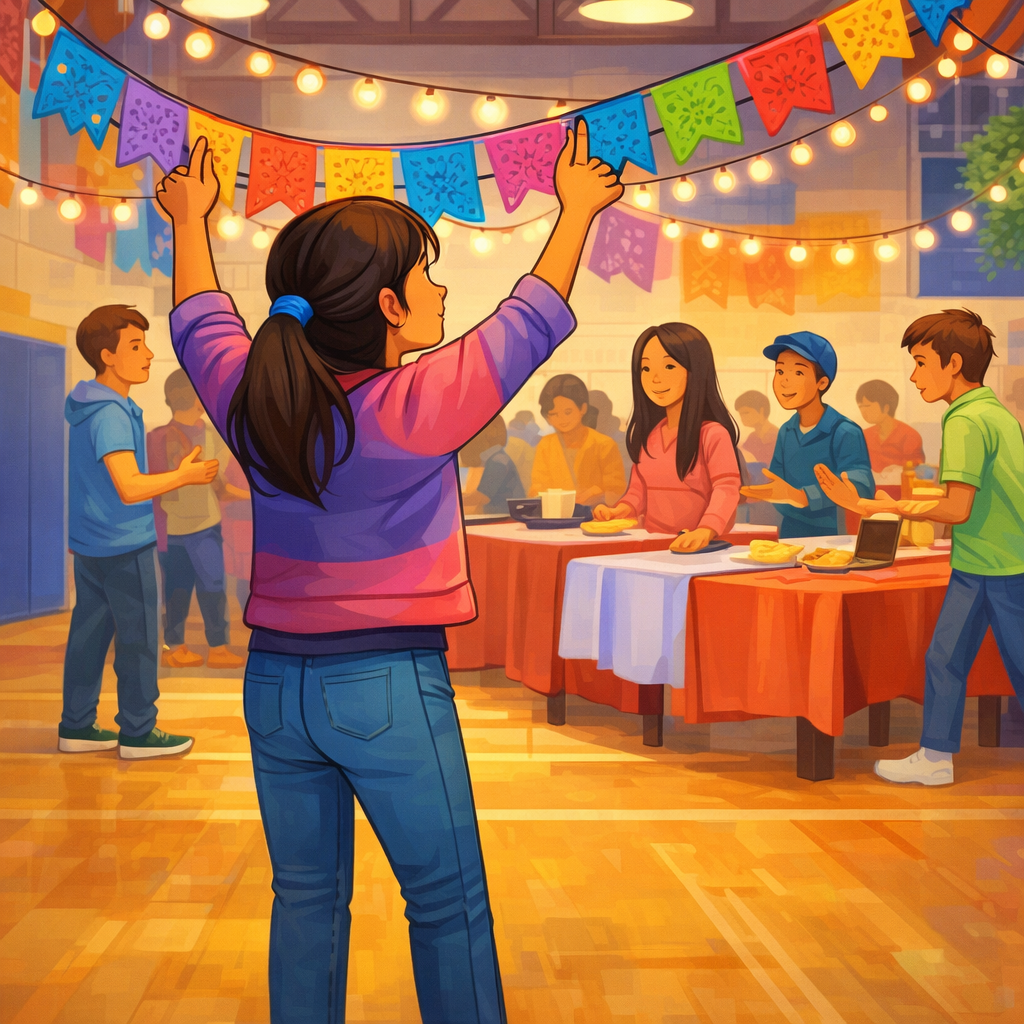 Avec le gymnase de l’école sécurisé, l’équipe se concentra sur la transformation de l’espace. Leila mena la charge, rassemblant des fournitures et recrutant des volontaires du club d’art pour aider à créer des décorations.