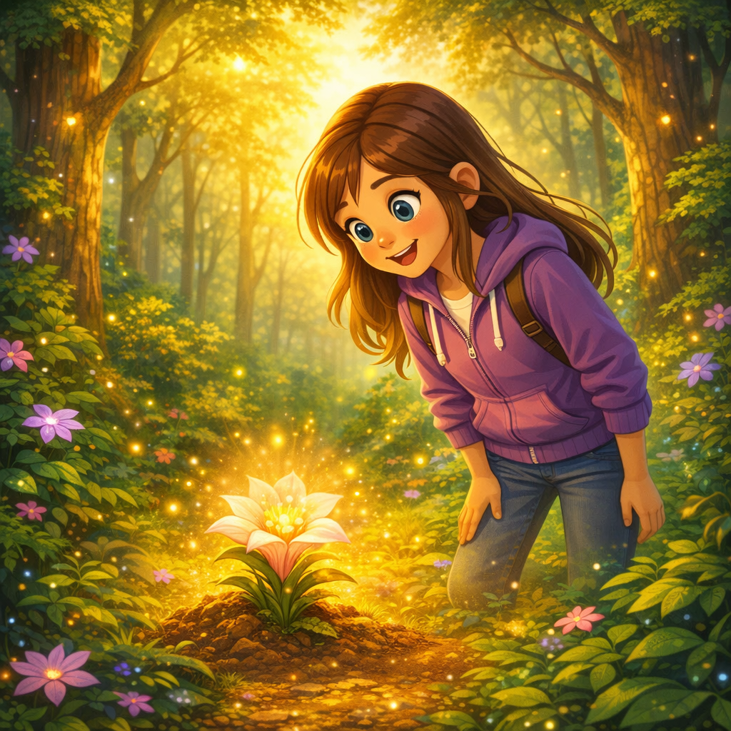 One evening, as the golden light of sunset spilled over the garden, Lila felt a strange pull towards the woods. She put on her sneakers, grabbed a flashlight, and tiptoed towards the thicket. Her heart raced as she pushed through the bushes and entered a small clearing.
