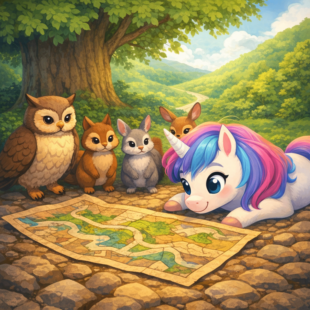 The next morning, Luna awoke to a commotion in the valley. The animals were gathered around an ancient map, chattering animatedly. "What’s happening?" Luna asked, curious.