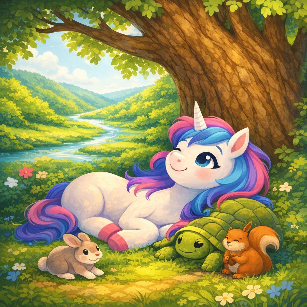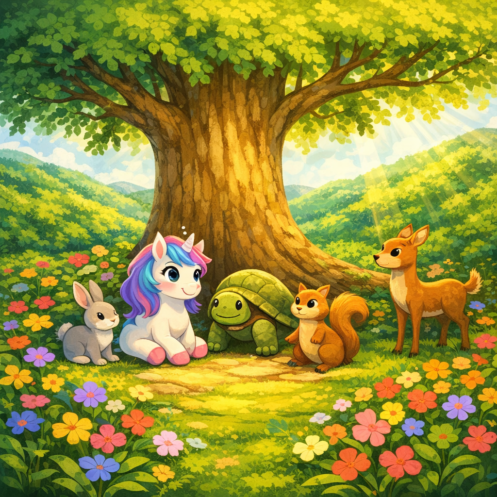Following Thumper’s lead, Luna met a menagerie of animals: a wise old tortoise, a chatty squirrel, and a graceful deer. Each had their own story, and Luna listened eagerly, enchanted by the vibrant community she had discovered.