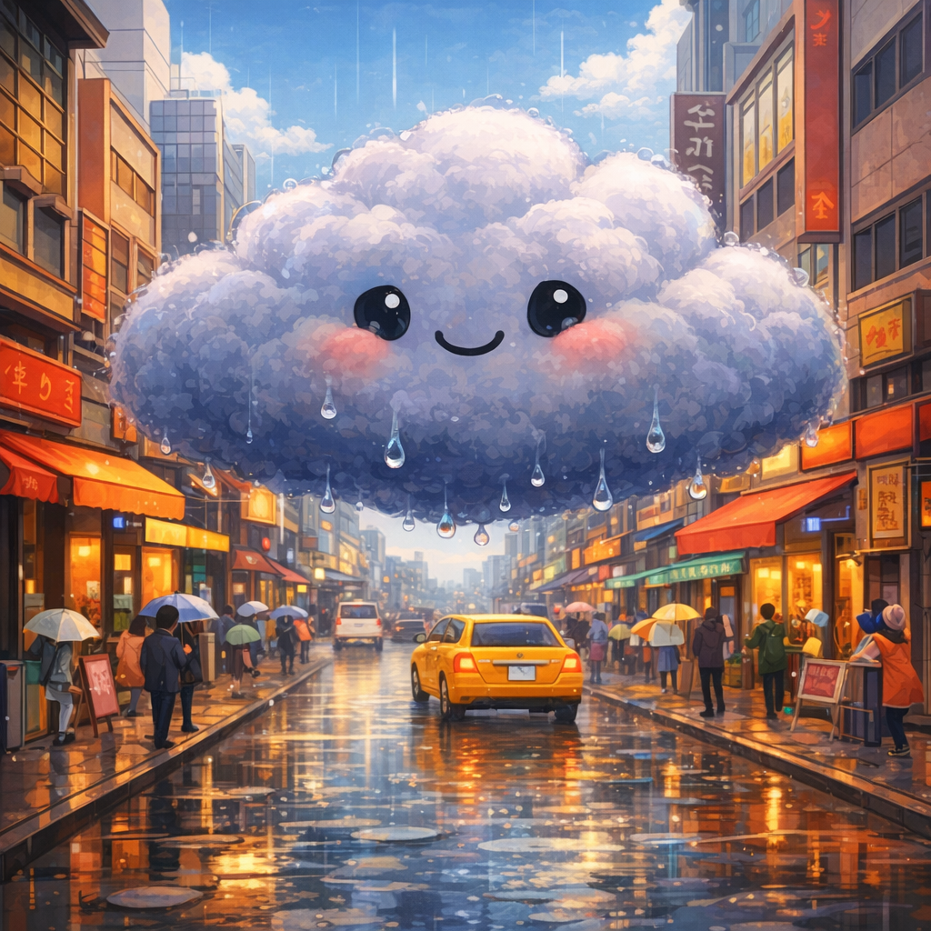 The rain fell gently, washing the city clean. Cars hissed through puddles. People opened umbrellas like bright flowers. And high above, lighter now, Nimbus smiled. Changing shape didn’t feel so scary anymore. It felt like part of a big, important job.
