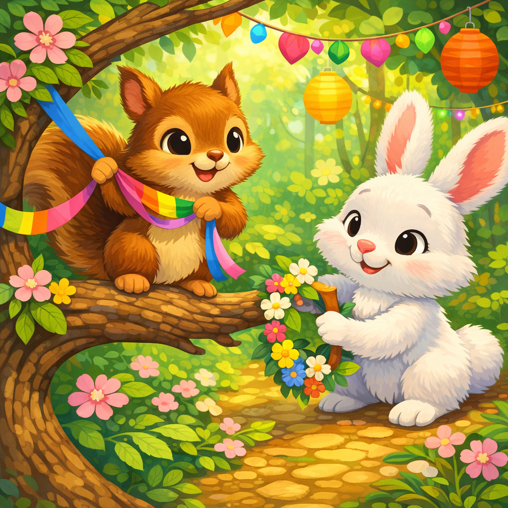 Sammy and Benny worked together, hanging colorful ribbons from branches and arranging flowers in beautiful patterns. Soon, the forest looked like a magical place, full of bright colors and cheerful sights.