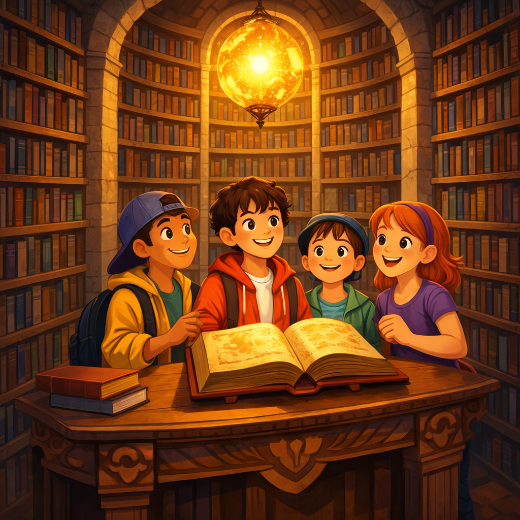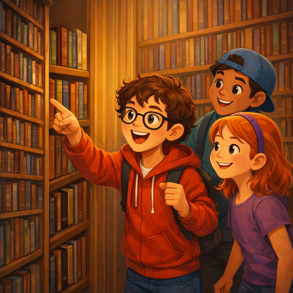 It was a sunny afternoon when Mia, Alex, Jordan, and Priya decided to visit their favorite place: the local library. The library, with its tall shelves and endless aisles of books, felt like a world of its own. Today, as the friends wandered through the rows of books, something unusual caught Alex’s eye.