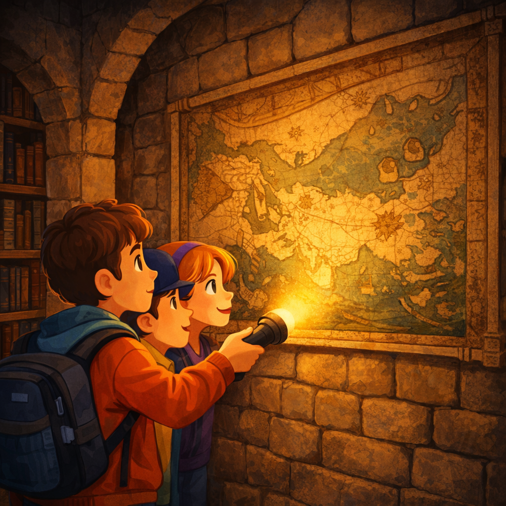 Mia unfolded the parchment carefully. ‘It’s a map,’ she declared, her eyes wide with excitement. The map was old and seemed to have been hand-drawn, with intricate symbols and markings. ‘I think it’s leading us somewhere in the library,’ Priya said, tracing a path with her finger.
