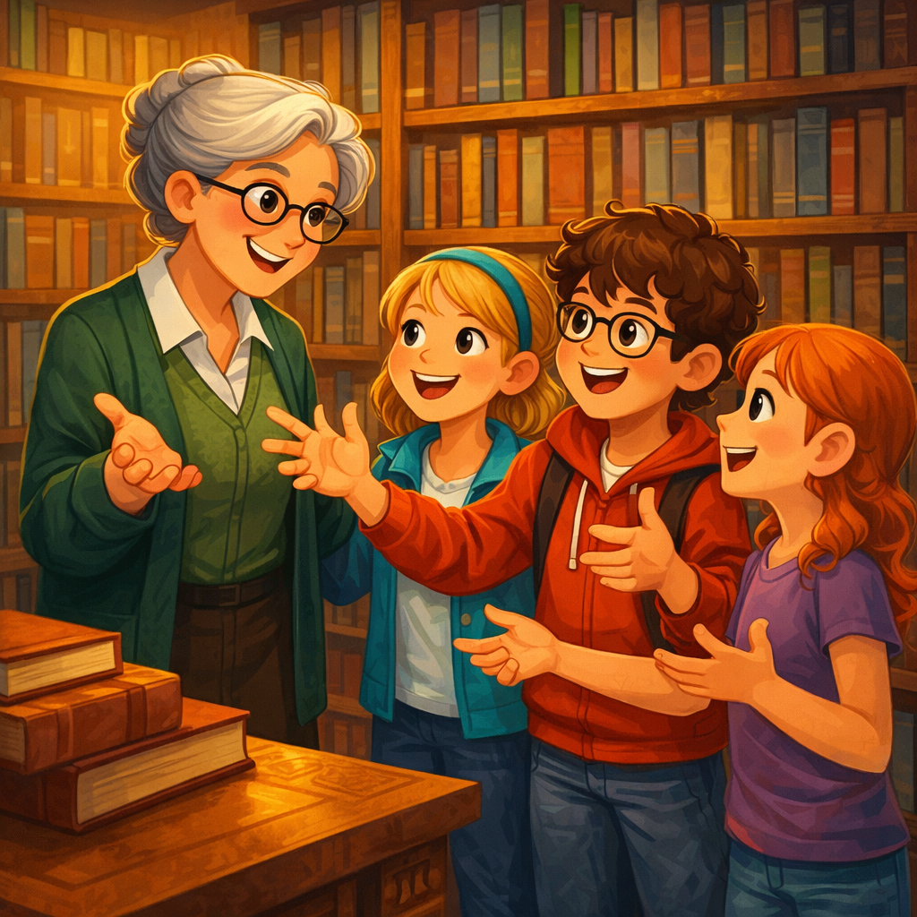 With their mystery solved, the children decided to share their discovery with the librarian, Mrs. Green. She was as astonished as the children when she learned about the hidden passage and the book.