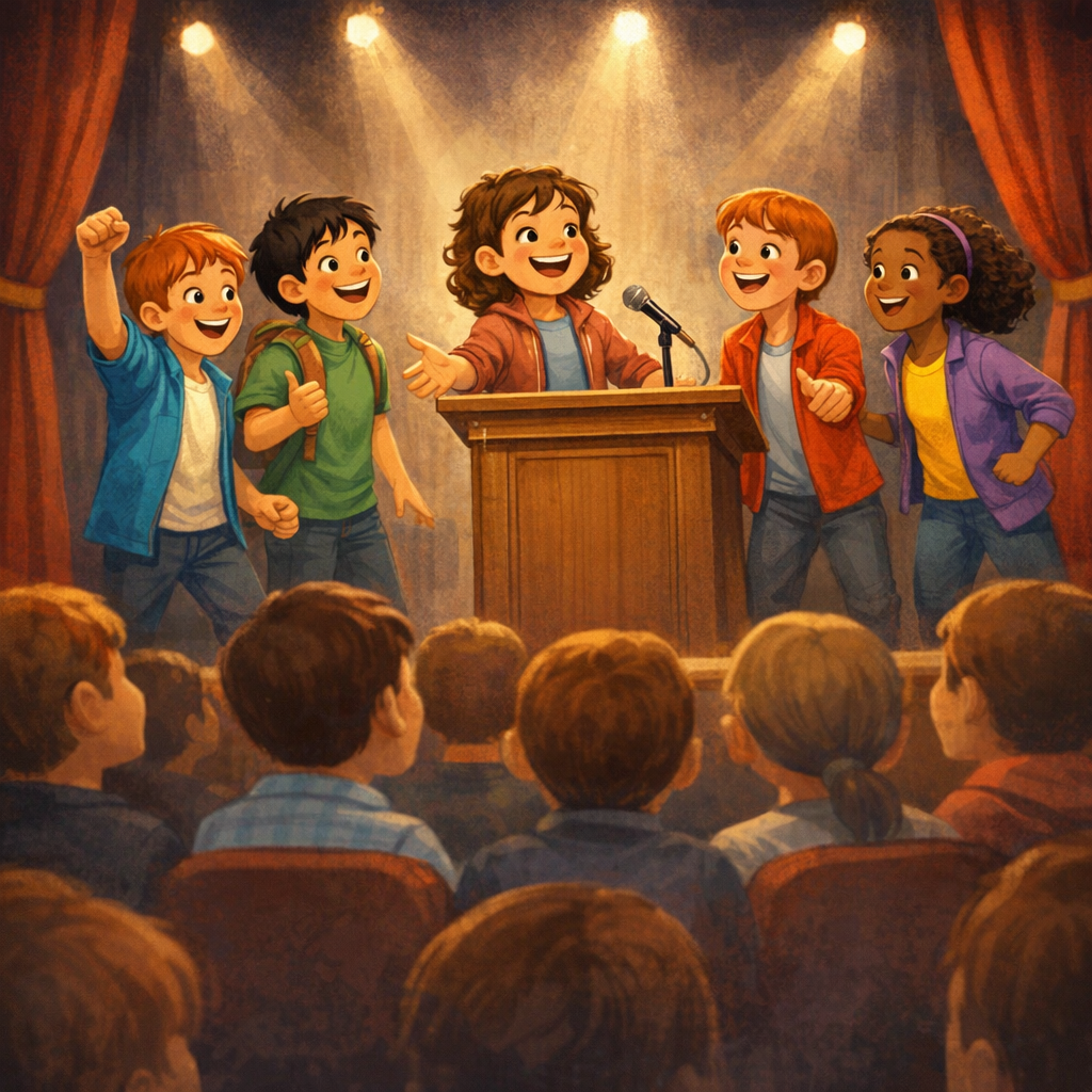 The friends couldn’t help but smile as they left the stage. They had not only solved a mystery but had also contributed to their school’s legacy in a meaningful way.