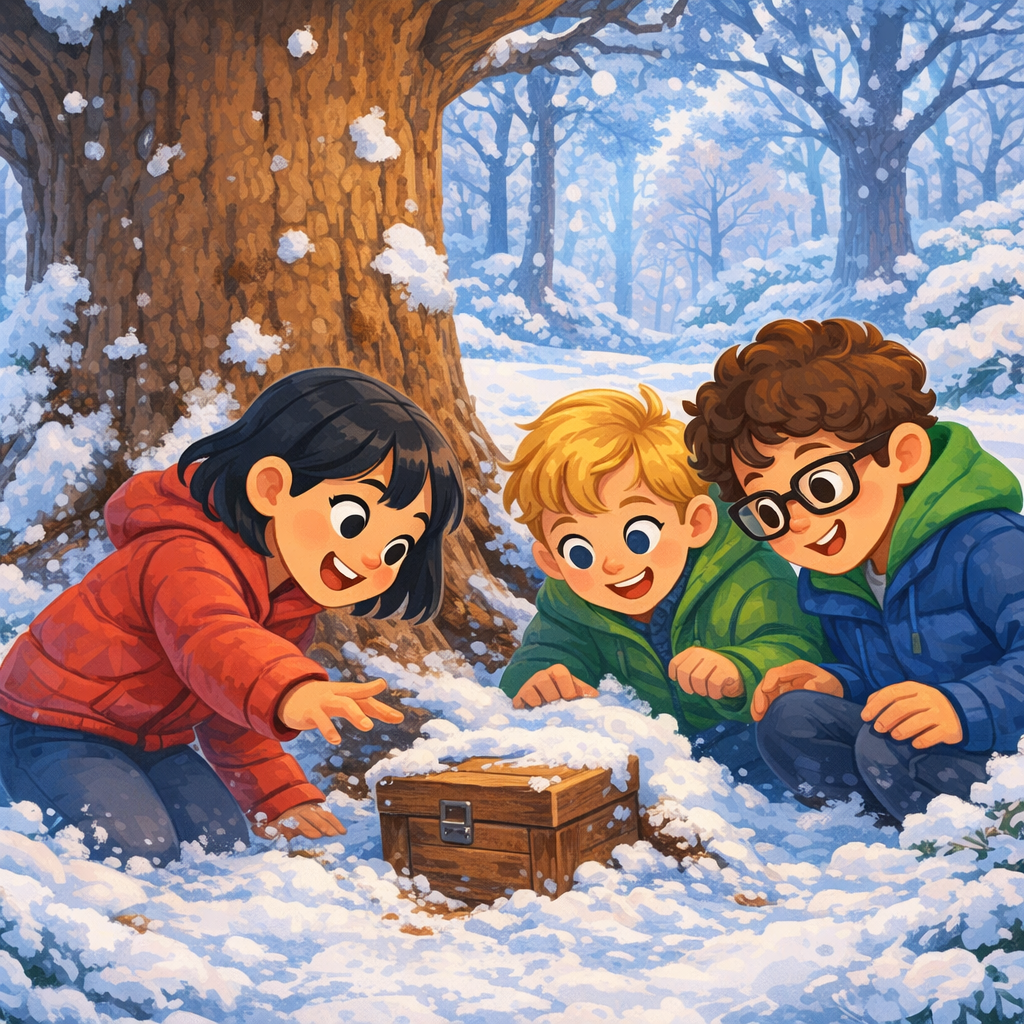 "That’s the old oak tree in Willow Woods!" Jake exclaimed. "It’s not too far," Mia added, her breath visible in the chilly air. Determined to solve the mystery, they set off through the snow once more.