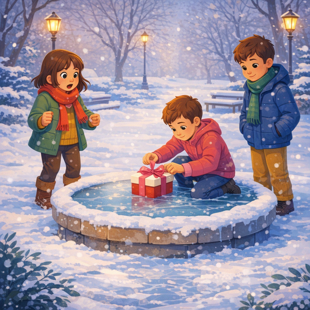 The park was quiet as the trio arrived, the fountain standing proudly in the center, its water frozen into beautiful, crystalline shapes. They approached cautiously, excitement and uncertainty mingling in their hearts.
