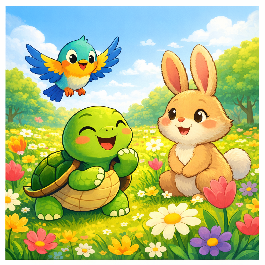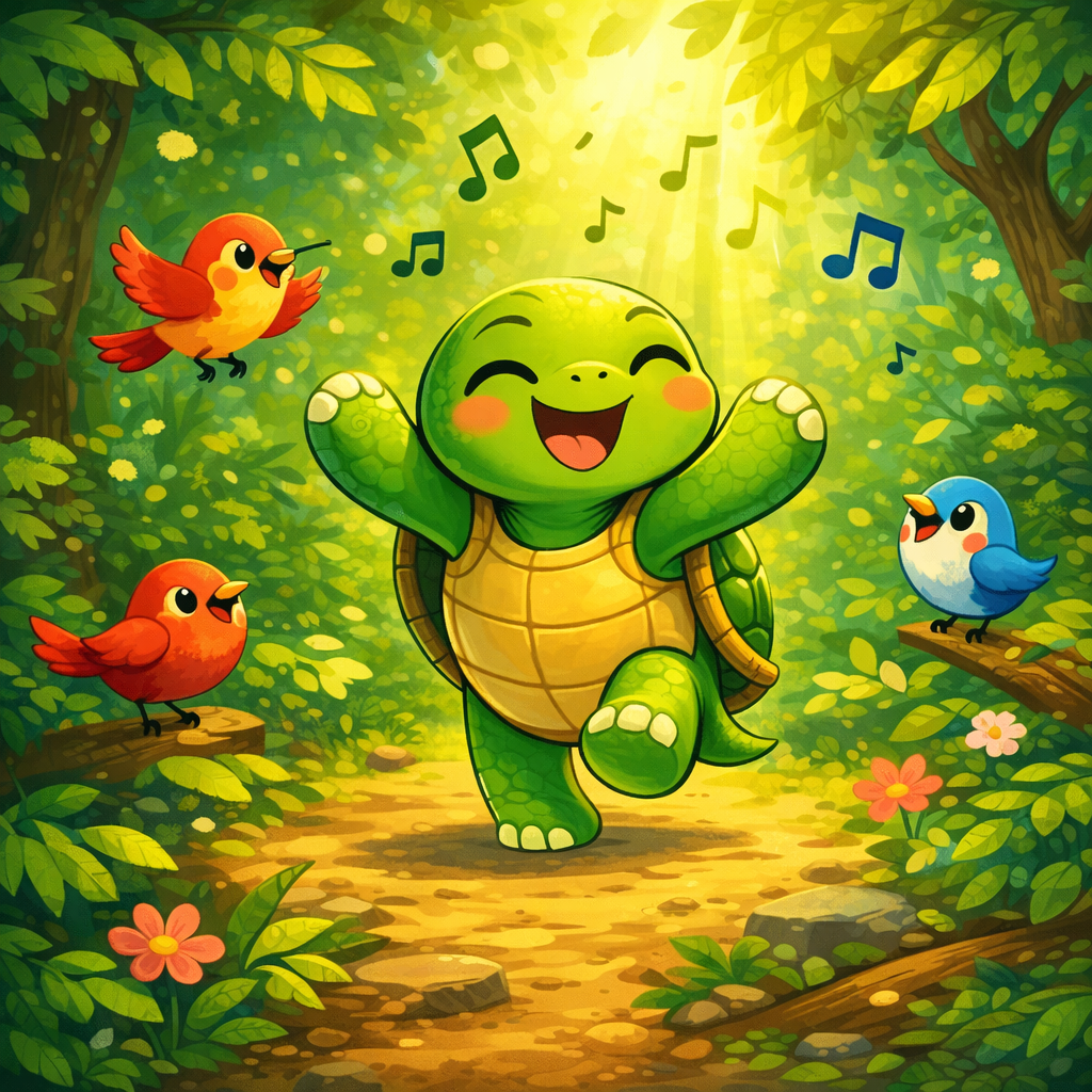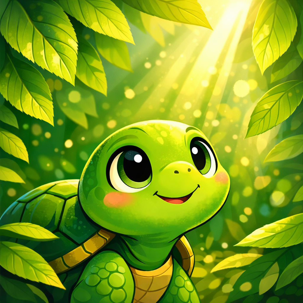Once upon a time, in a bright and sunny forest, there lived a tiny turtle named Tilly. Tilly loved to watch the sun dance on the leaves. She wished she could dance like the sunbeams too.