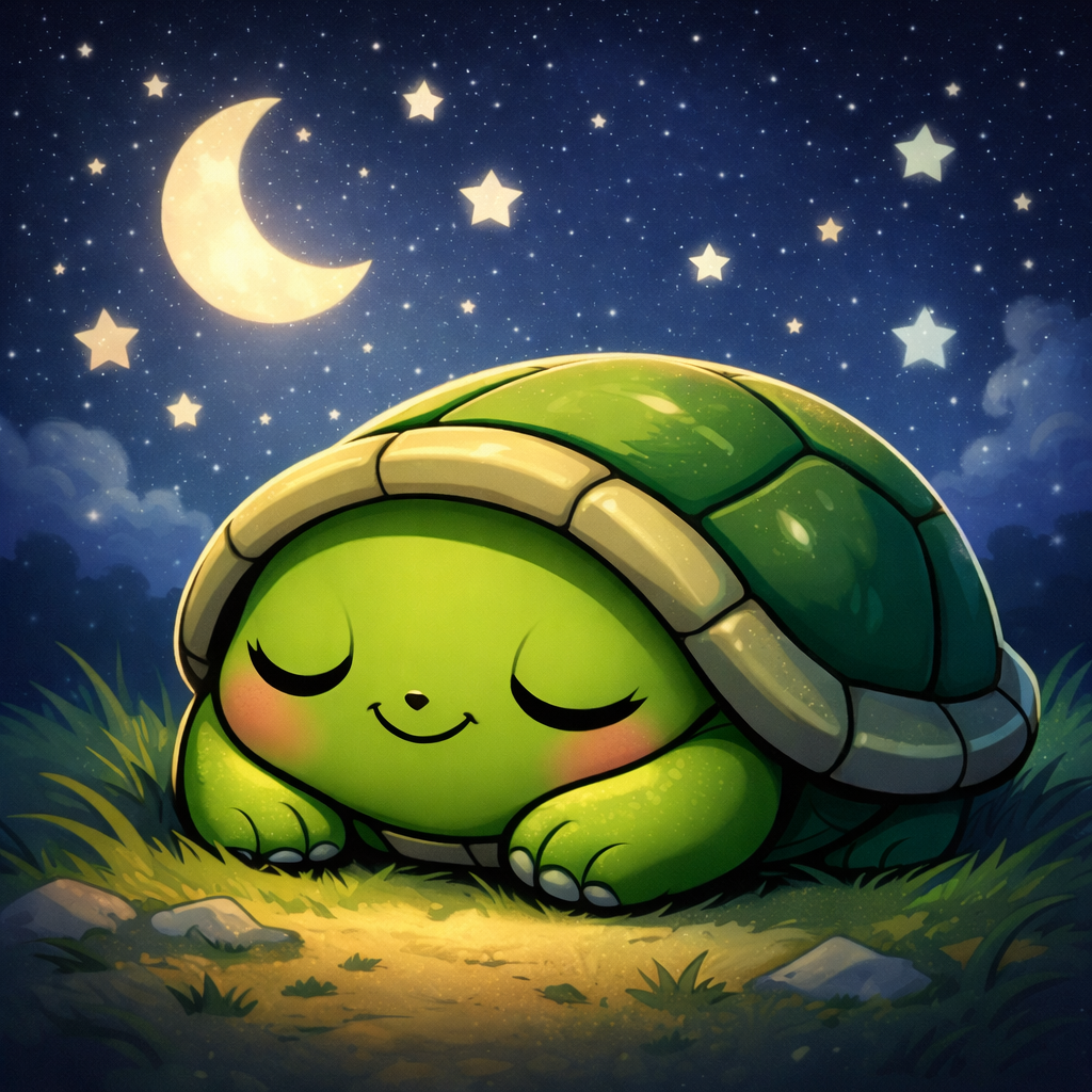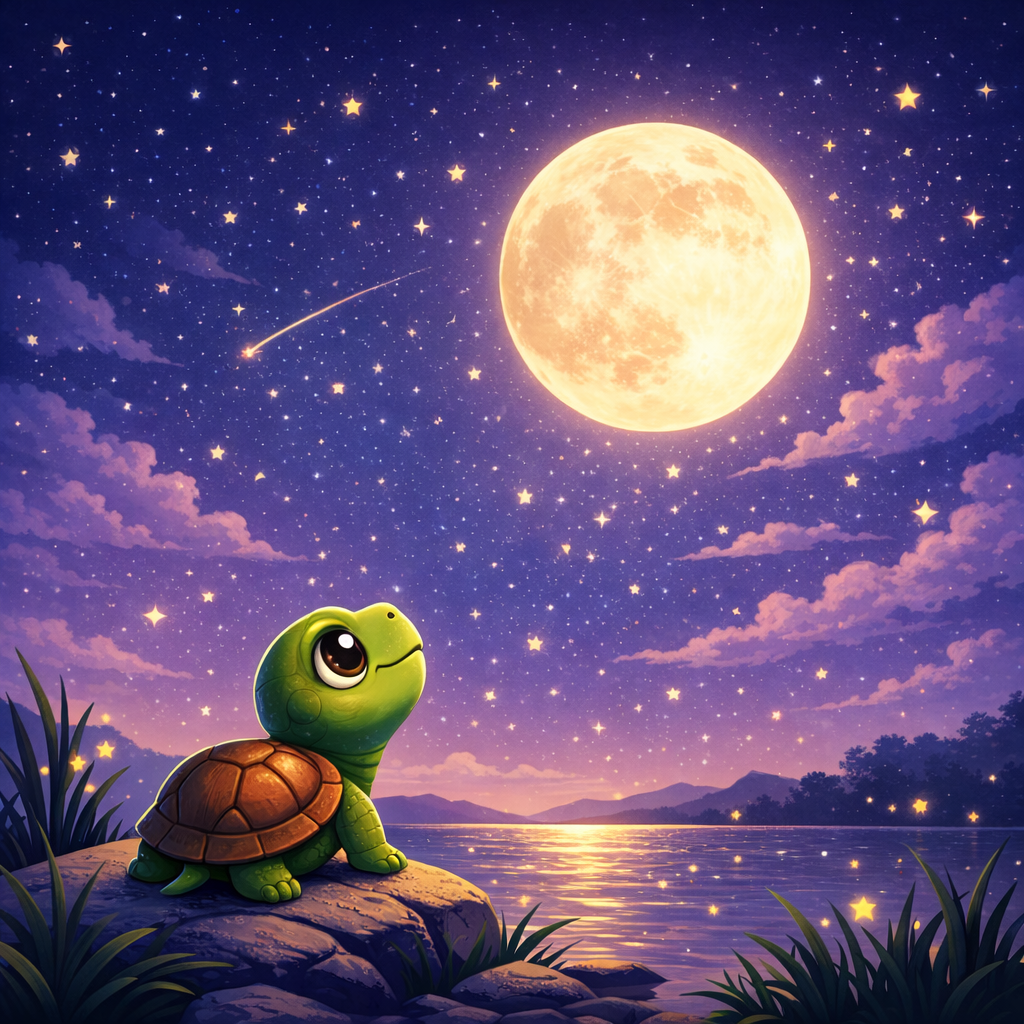 The moon and stars whispered back, ‘Goodnight, Tiny Turtle.’ And with a gentle sigh, Tiny Turtle drifted into a cozy slumber, dreaming of more adventures under the beautiful night sky.