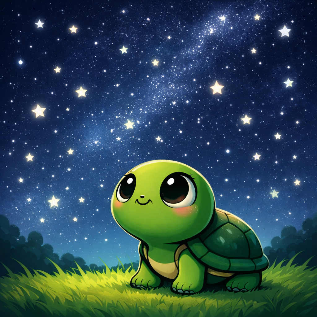 Once upon a time, when the sky was dark and the stars twinkled bright, a little turtle named Tiny decided to explore.